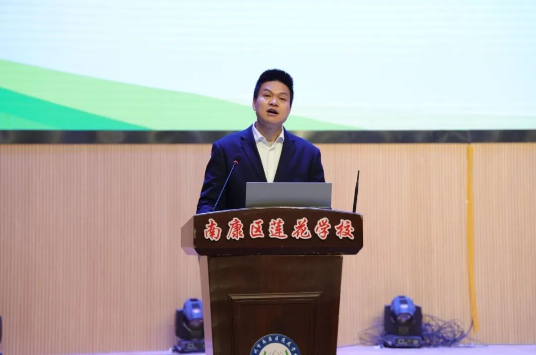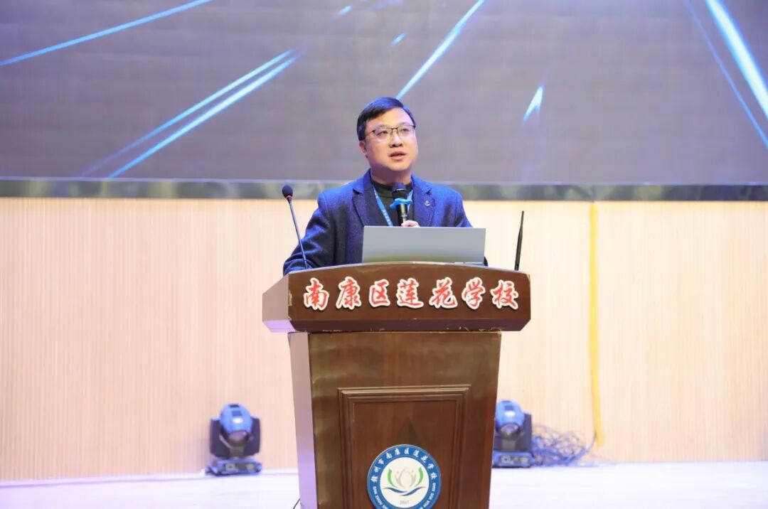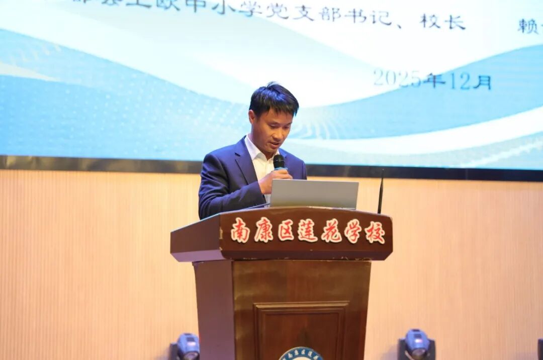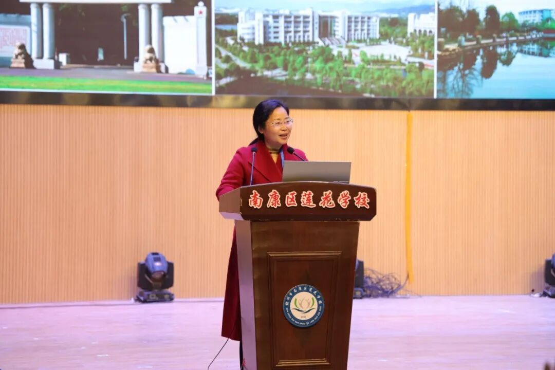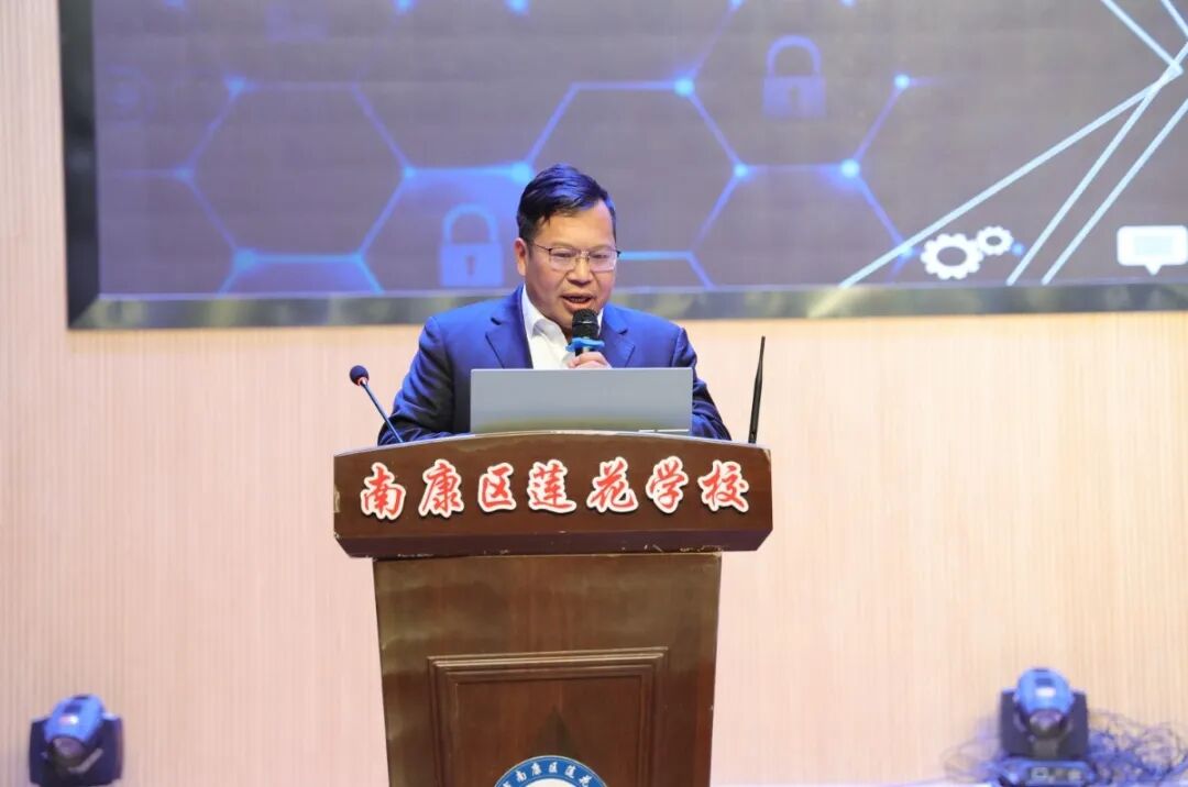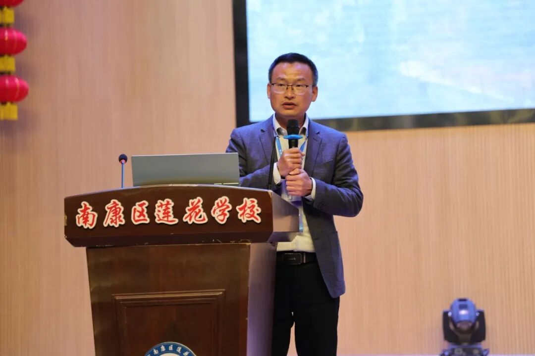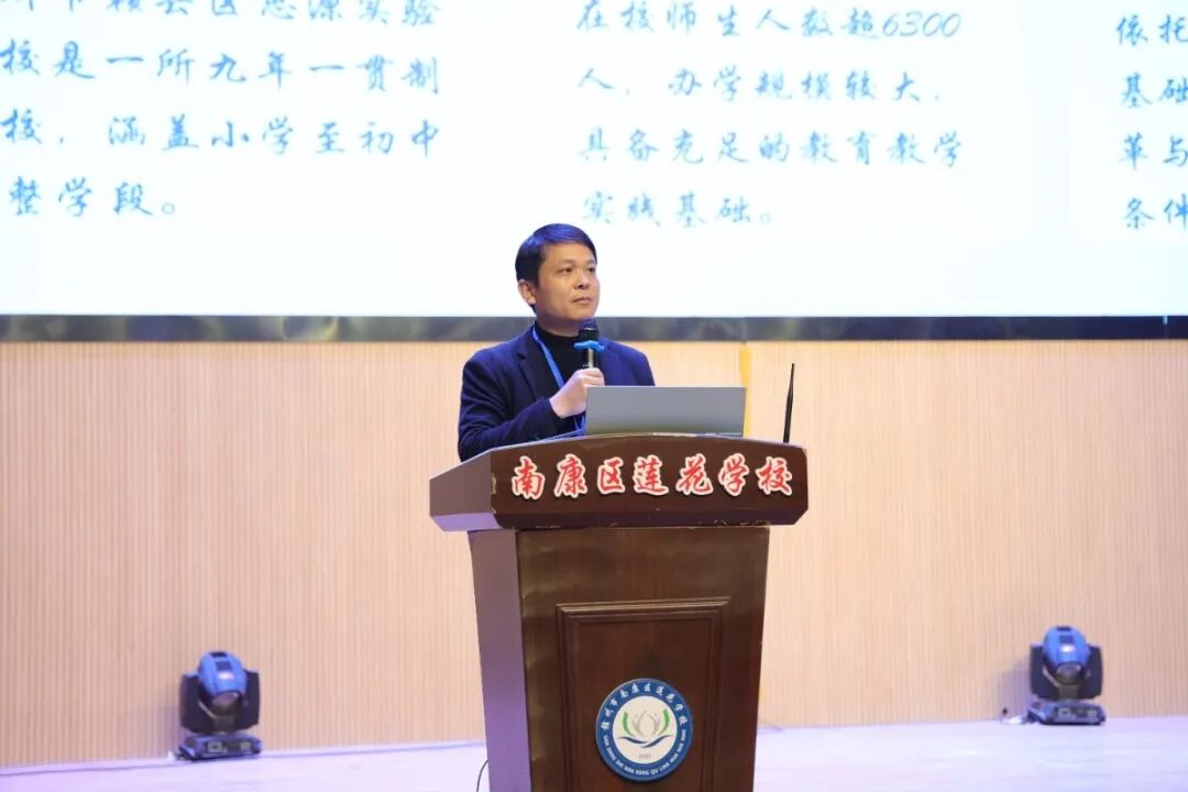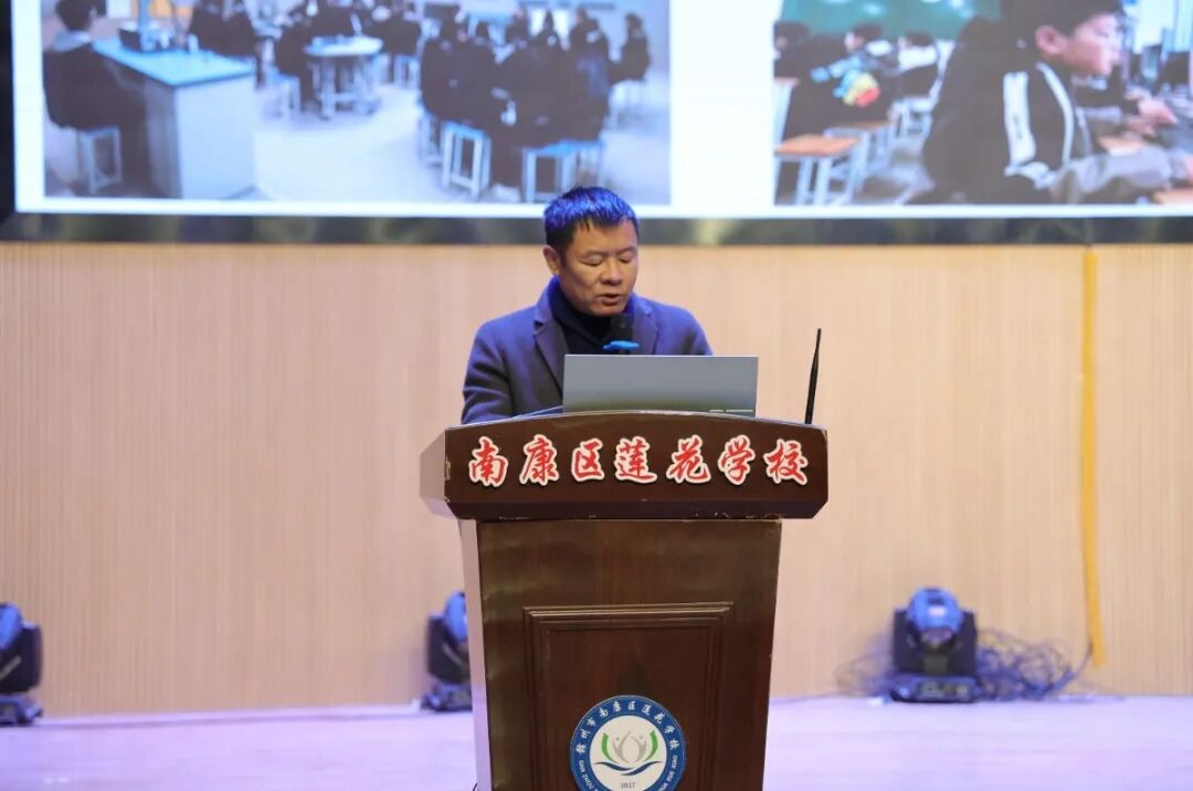 袁长鹏主任着重介绍了南康区莲花学校扎根南康沃土,以“党建红”领航,将红色基因融入办学血脉,筑牢育人初心;“科技蓝”赋能,借智慧课堂、科创实践提升教学效能,点亮创新引擎;“莲韵绿”润心,依托本土“莲”文化底色,涵养高洁品格,厚植人文沃土。