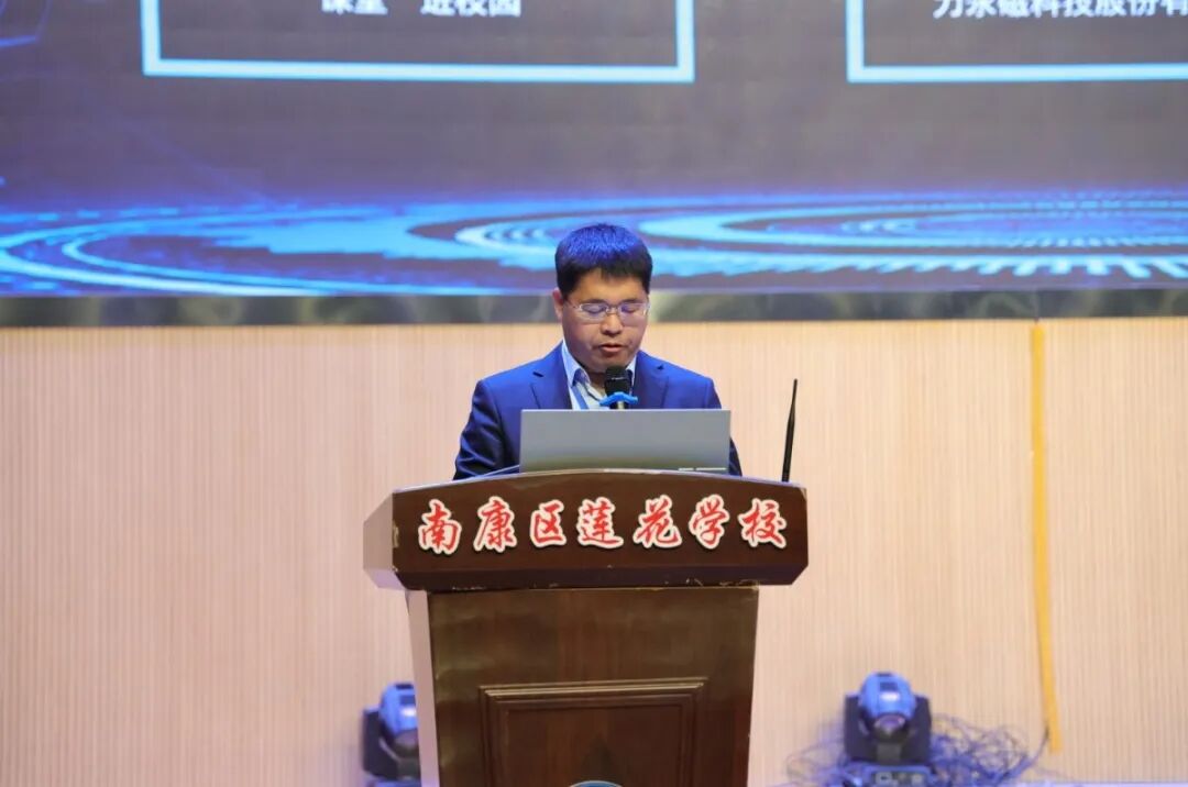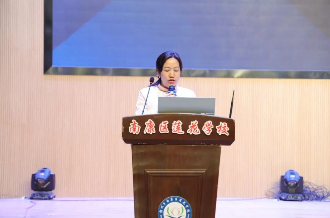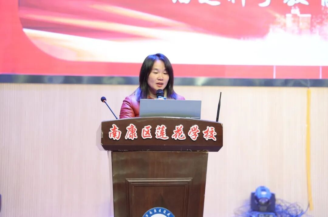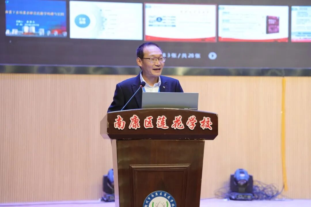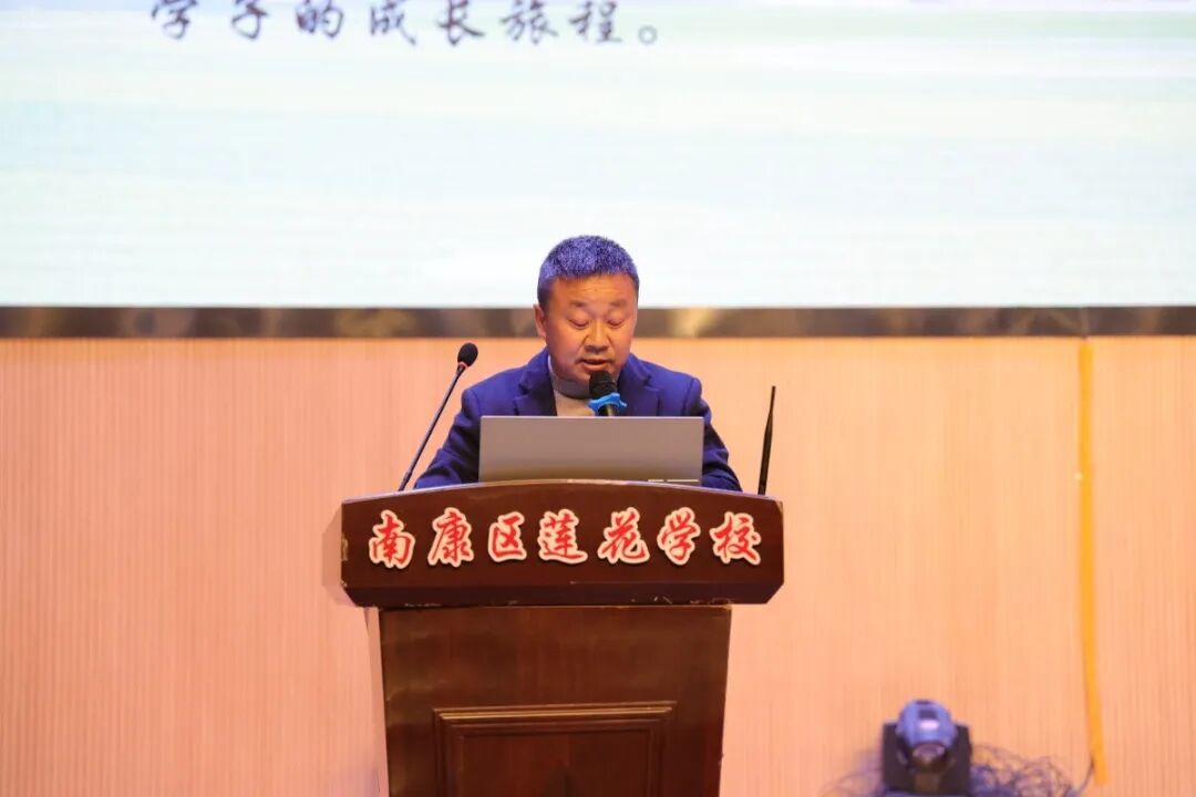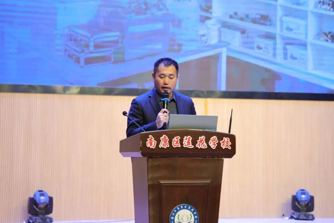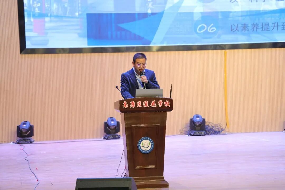 袁长鹏主任着重介绍了南康区莲花学校扎根南康沃土,以“党建红”领航,将红色基因融入办学血脉,筑牢育人初心;“科技蓝”赋能,借智慧课堂、科创实践提升教学效能,点亮创新引擎;“莲韵绿”润心,依托本土“莲”文化底色,涵养高洁品格,厚植人文沃土。