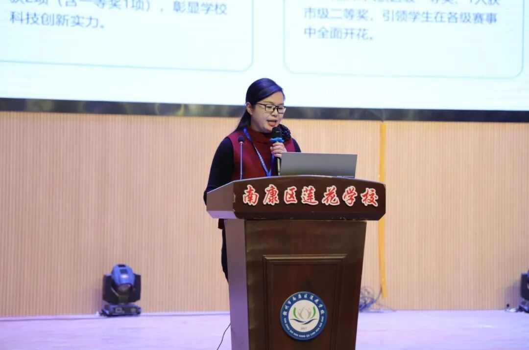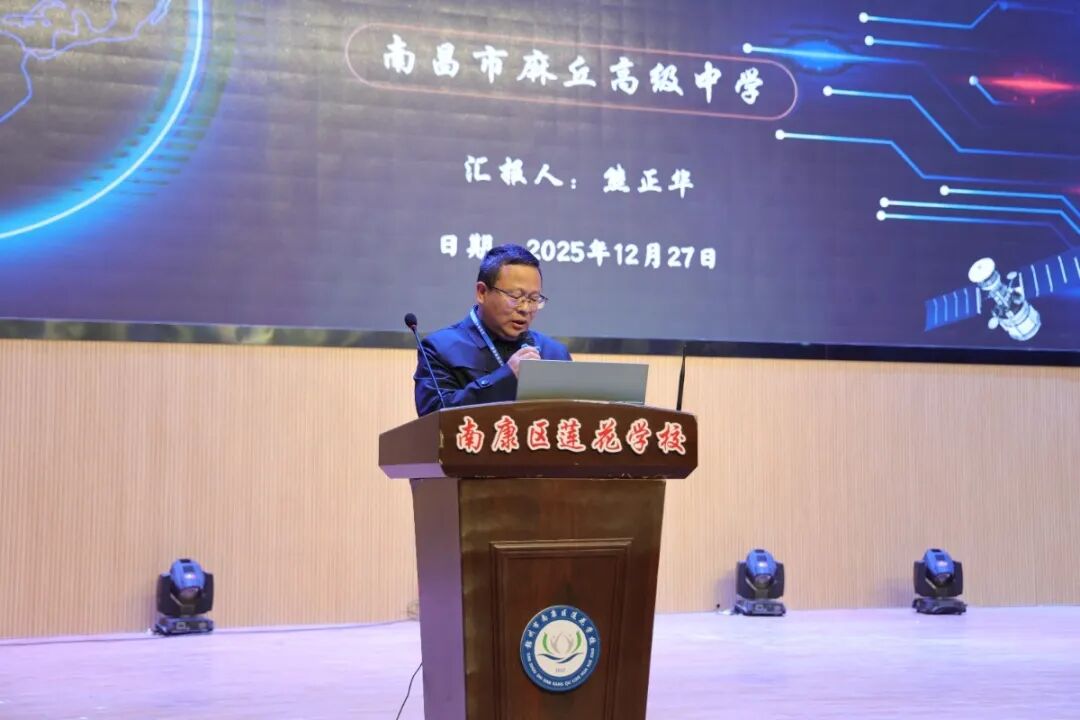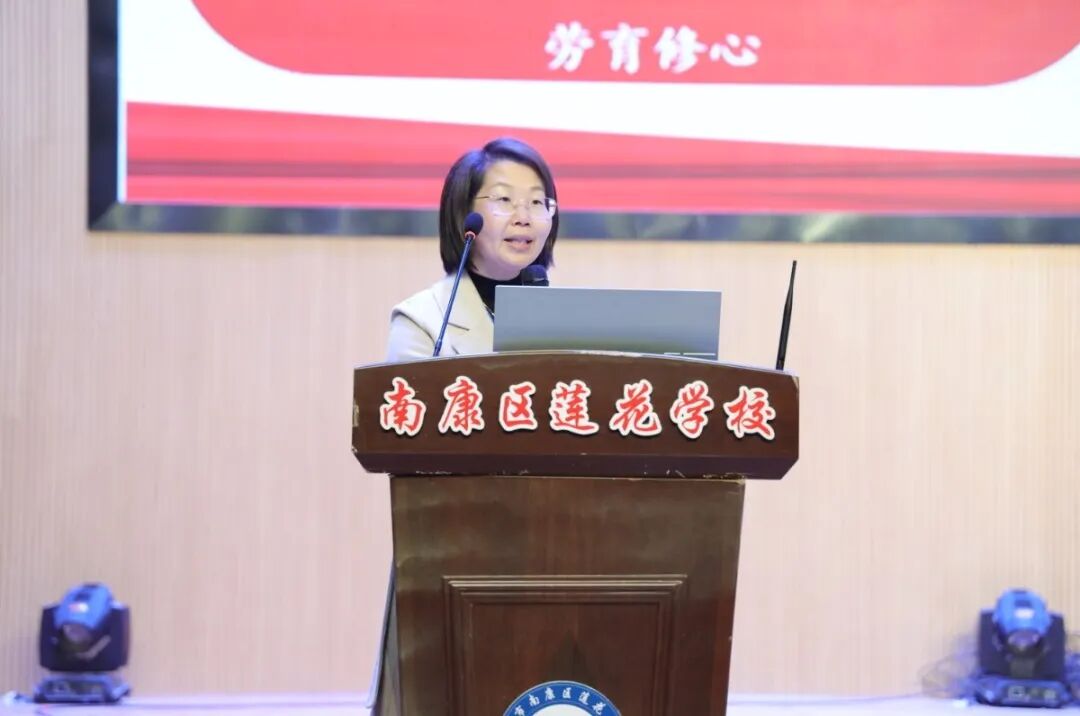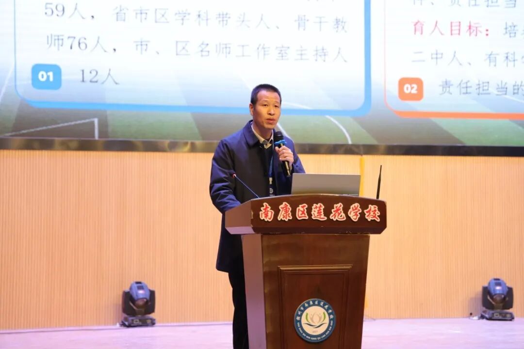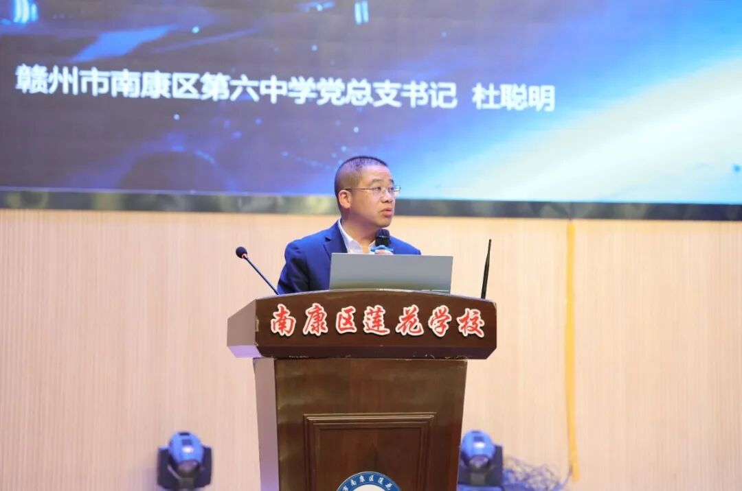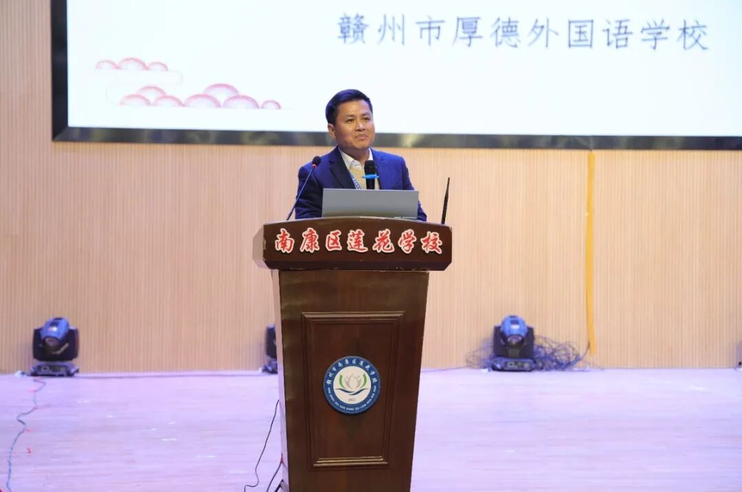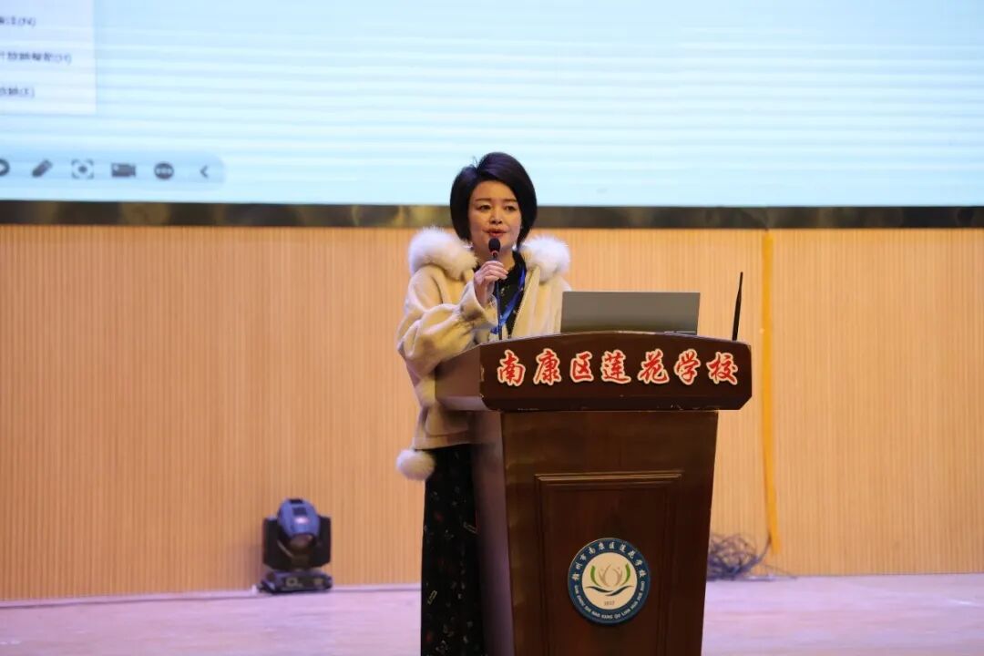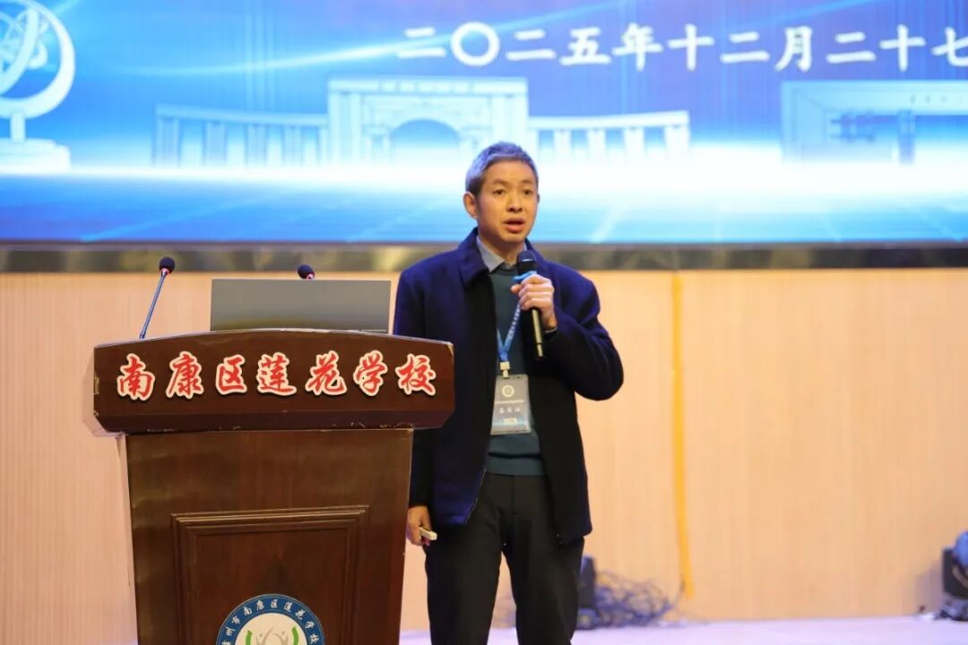 袁长鹏主任着重介绍了南康区莲花学校扎根南康沃土,以“党建红”领航,将红色基因融入办学血脉,筑牢育人初心;“科技蓝”赋能,借智慧课堂、科创实践提升教学效能,点亮创新引擎;“莲韵绿”润心,依托本土“莲”文化底色,涵养高洁品格,厚植人文沃土。