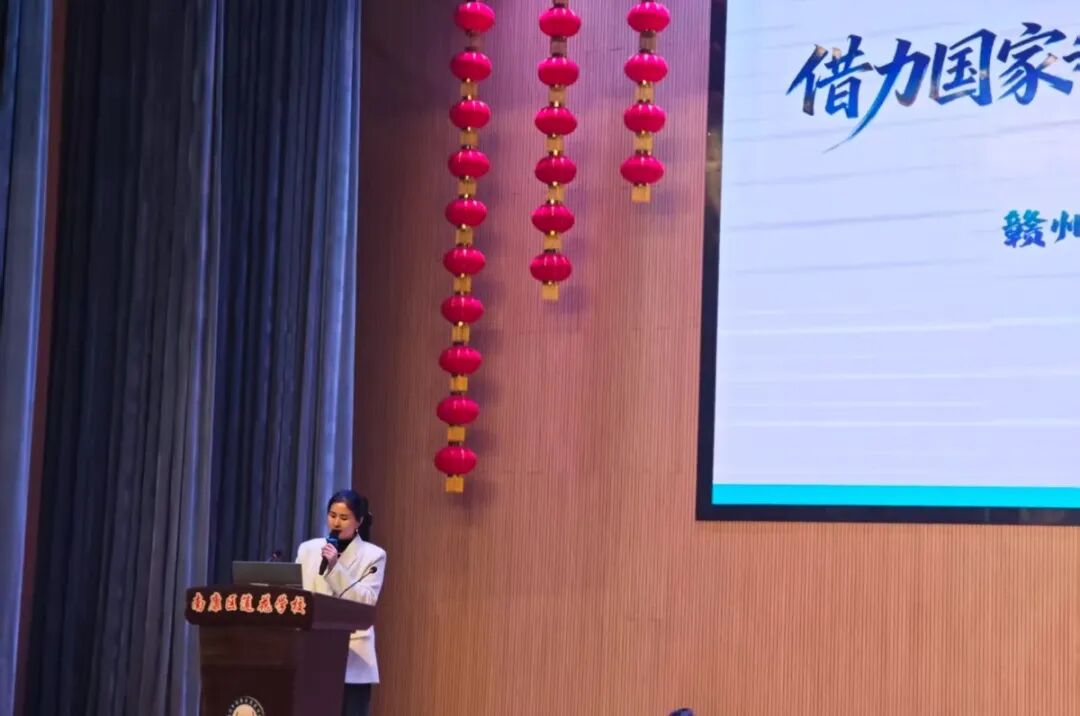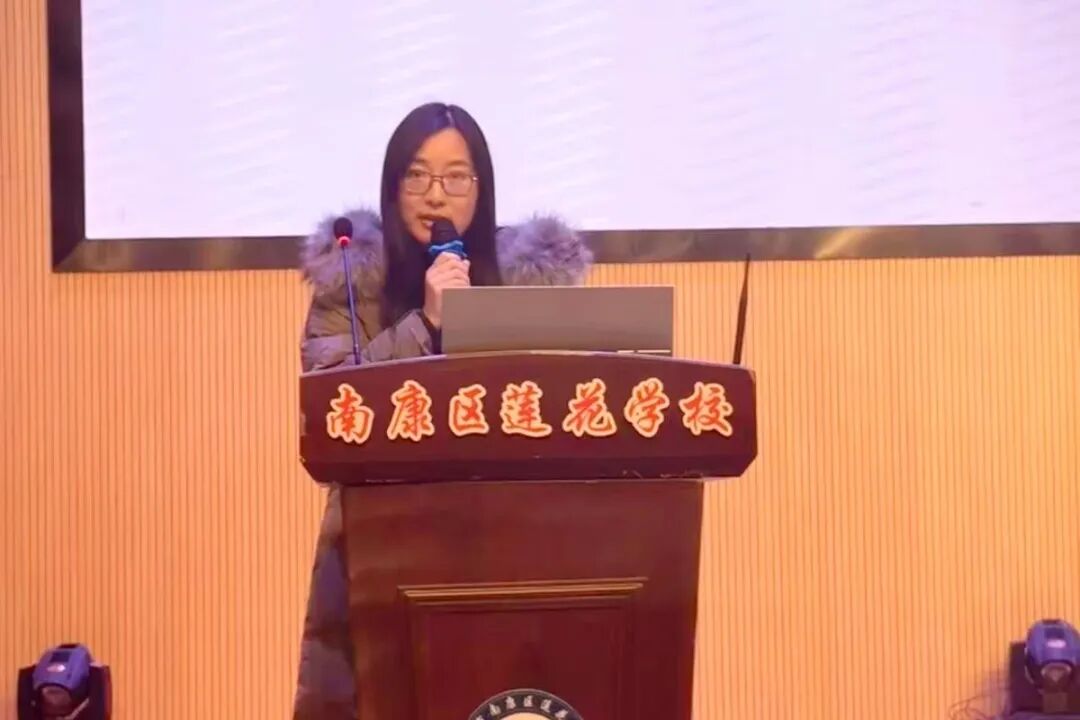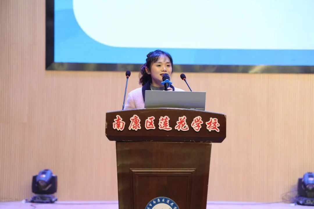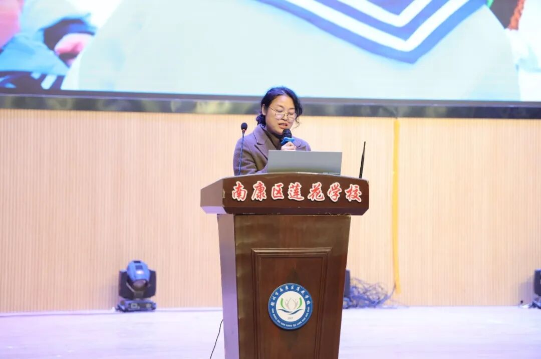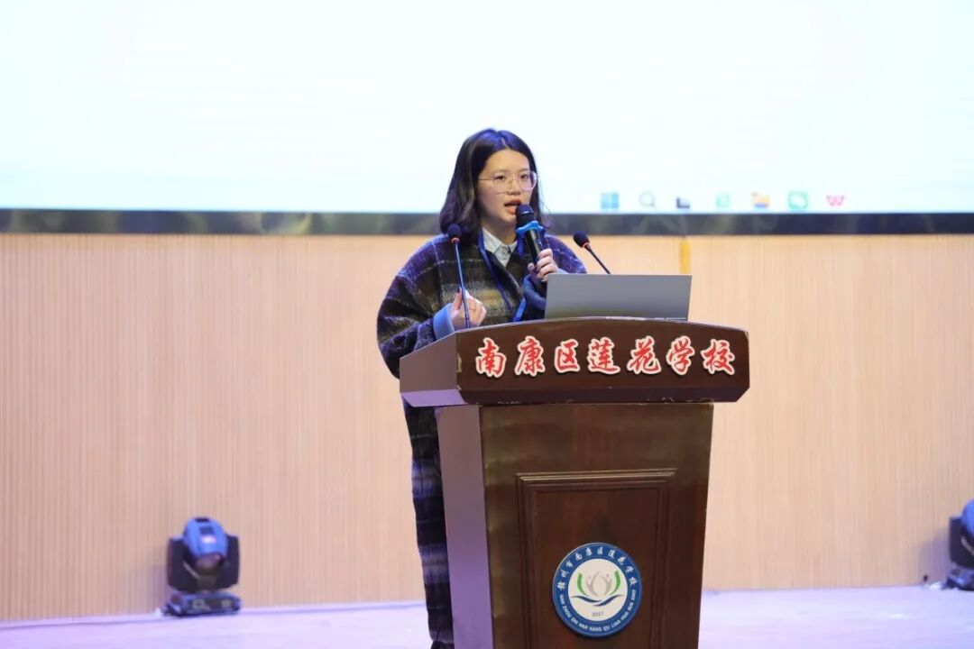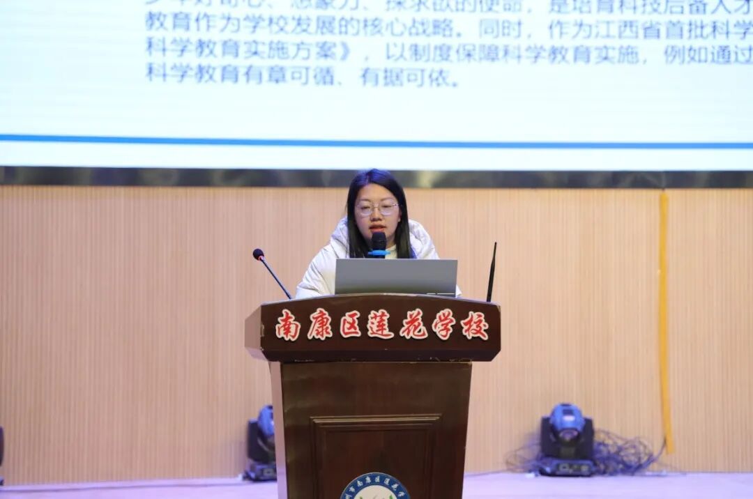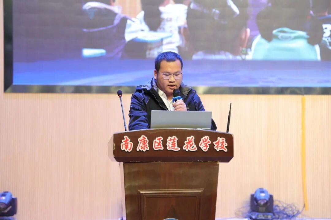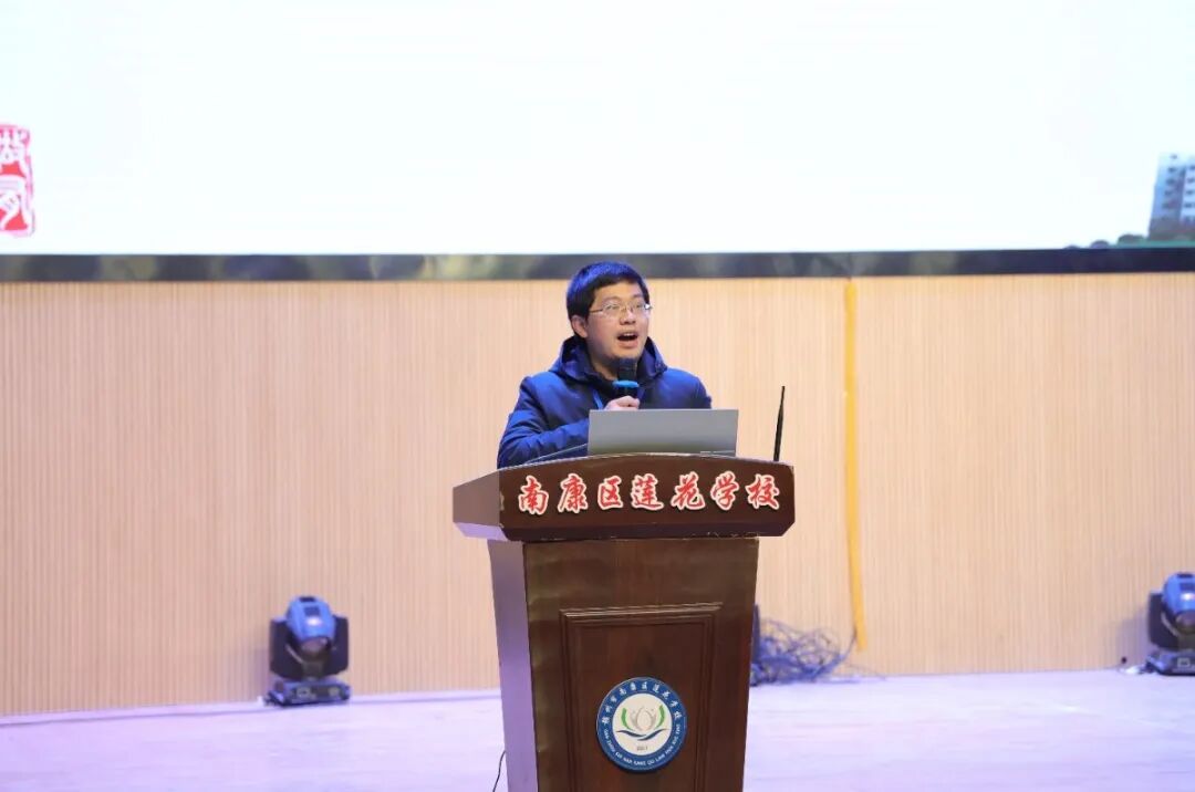 袁长鹏主任着重介绍了南康区莲花学校扎根南康沃土,以“党建红”领航,将红色基因融入办学血脉,筑牢育人初心;“科技蓝”赋能,借智慧课堂、科创实践提升教学效能,点亮创新引擎;“莲韵绿”润心,依托本土“莲”文化底色,涵养高洁品格,厚植人文沃土。
